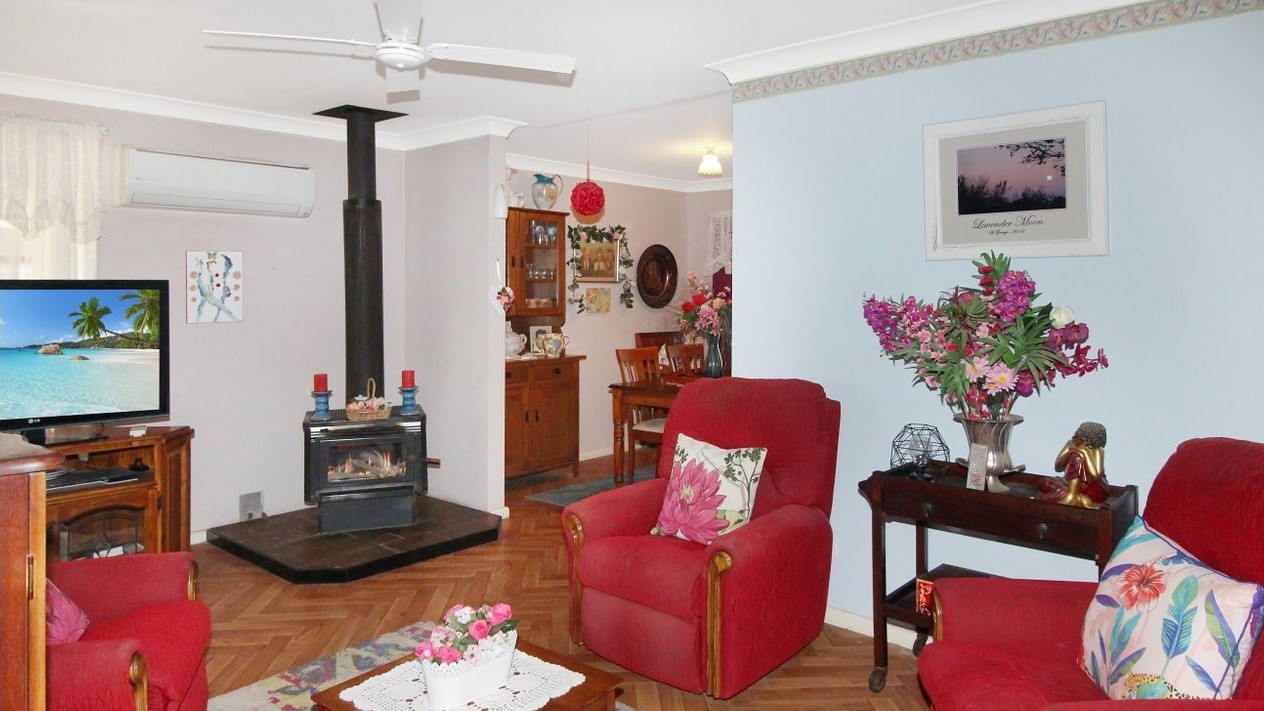• Living area with wood fire and spilt system for year round comfort
